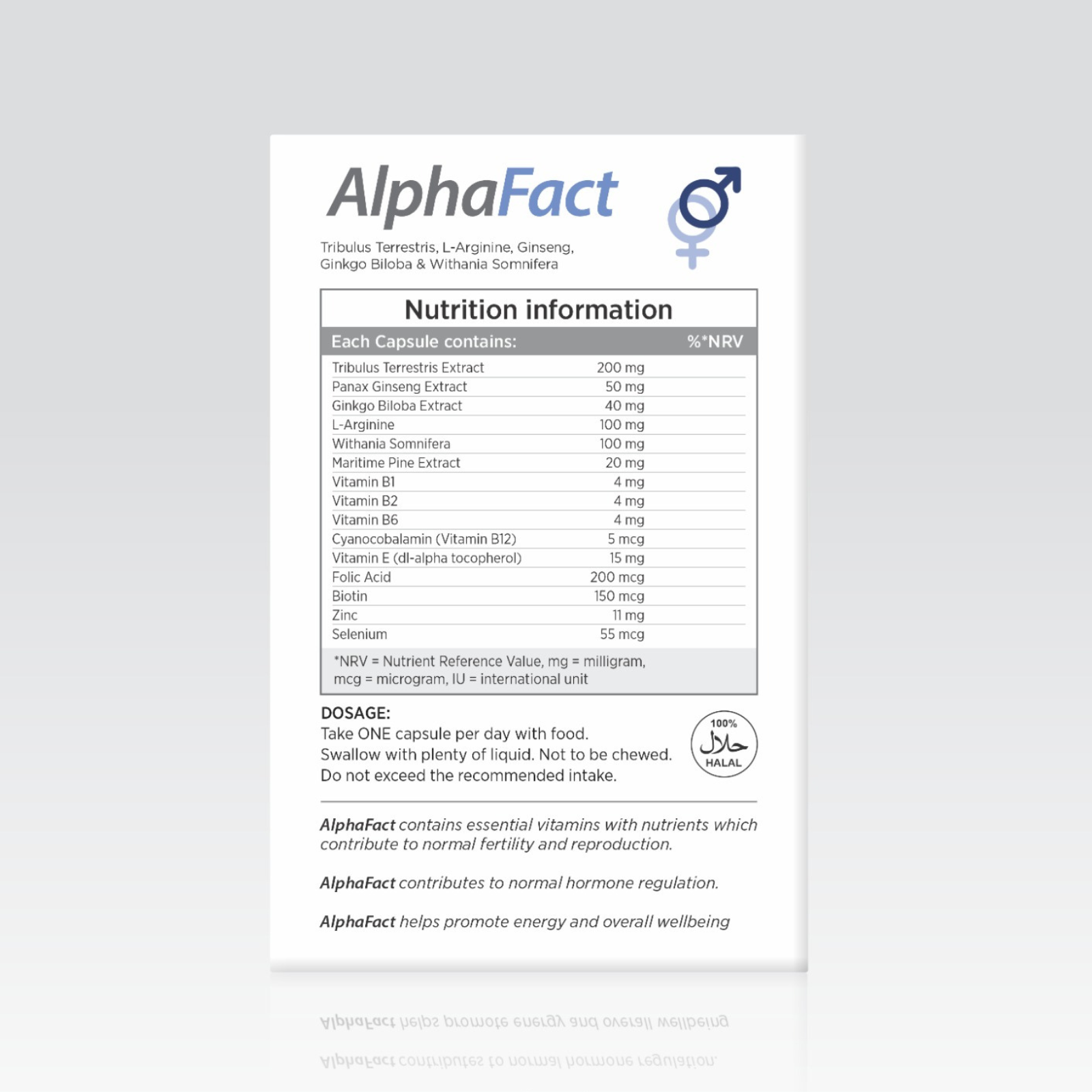 AlphaFact by Nutrifact is a premium daily food supplement formulated with a comprehensive blend of botanical extracts, vitamins, and minerals tailored to support men’s vitality, stamina, and reproductive health. Enriched with ingredients like Tribulus Terrestris, L-Arginine, Panax Ginseng, Ginkgo Biloba, and Withania Somnifera, AlphaFact supports normal hormone regulation, energy levels, and male reproductive function. It’s your everyday ally in enhancing physical performance and overall wellbeing.